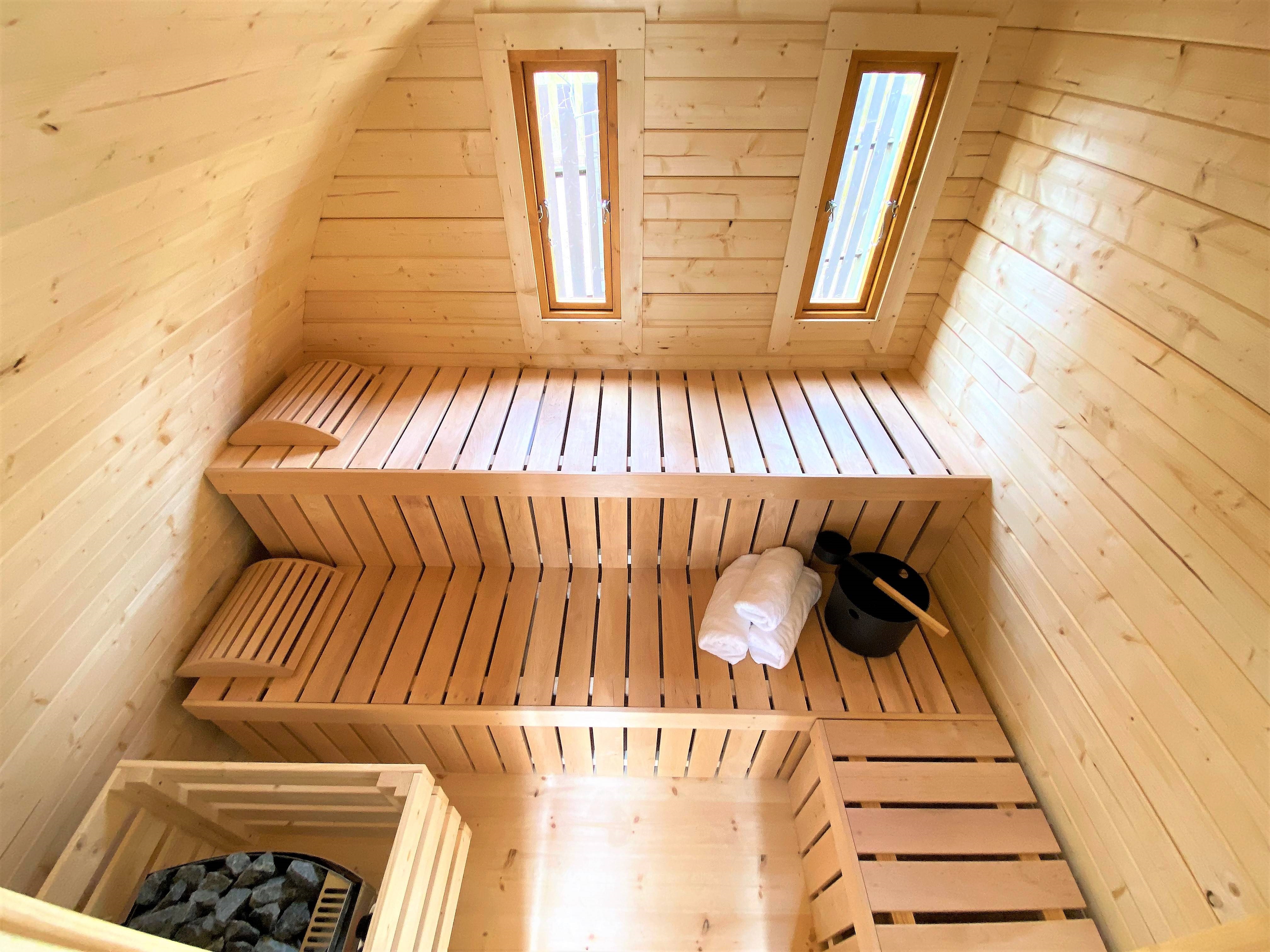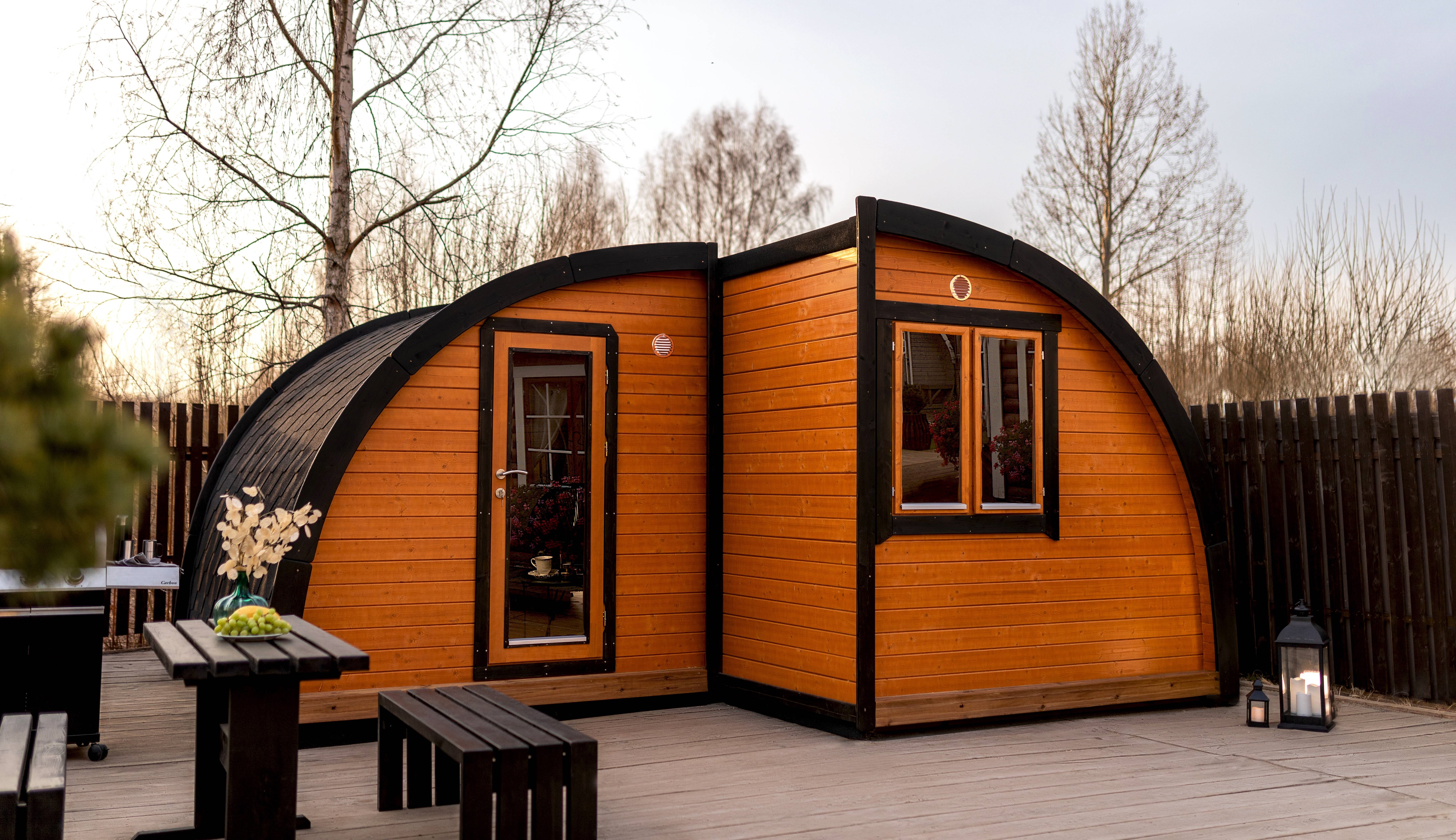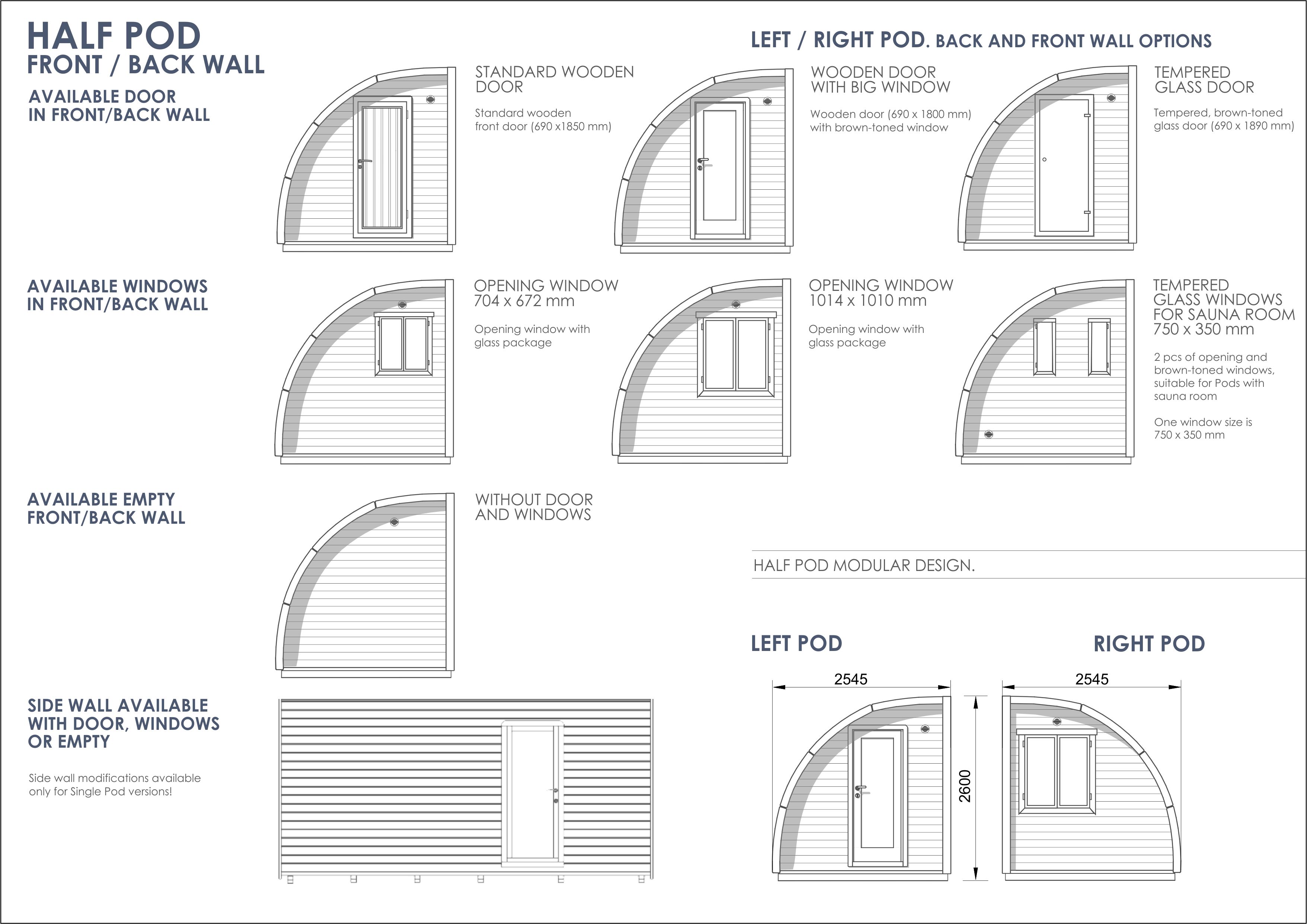 Jedes Half Pod (Typ und Größe des linken Pods / Typ und Größe des rechten Pods) ist in 3 verschiedenen Größen und Layouts erhältlich: mit oder ohne Terrasse, mit einem oder zwei Innenräumen. Pods können leer sein oder eine Sauna enthalten.