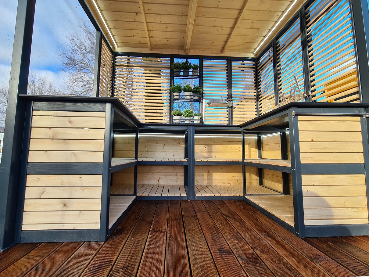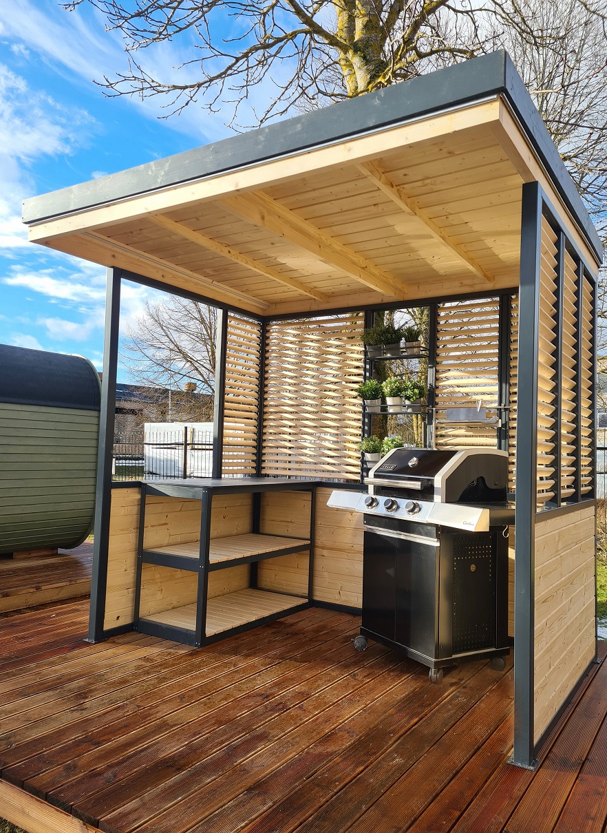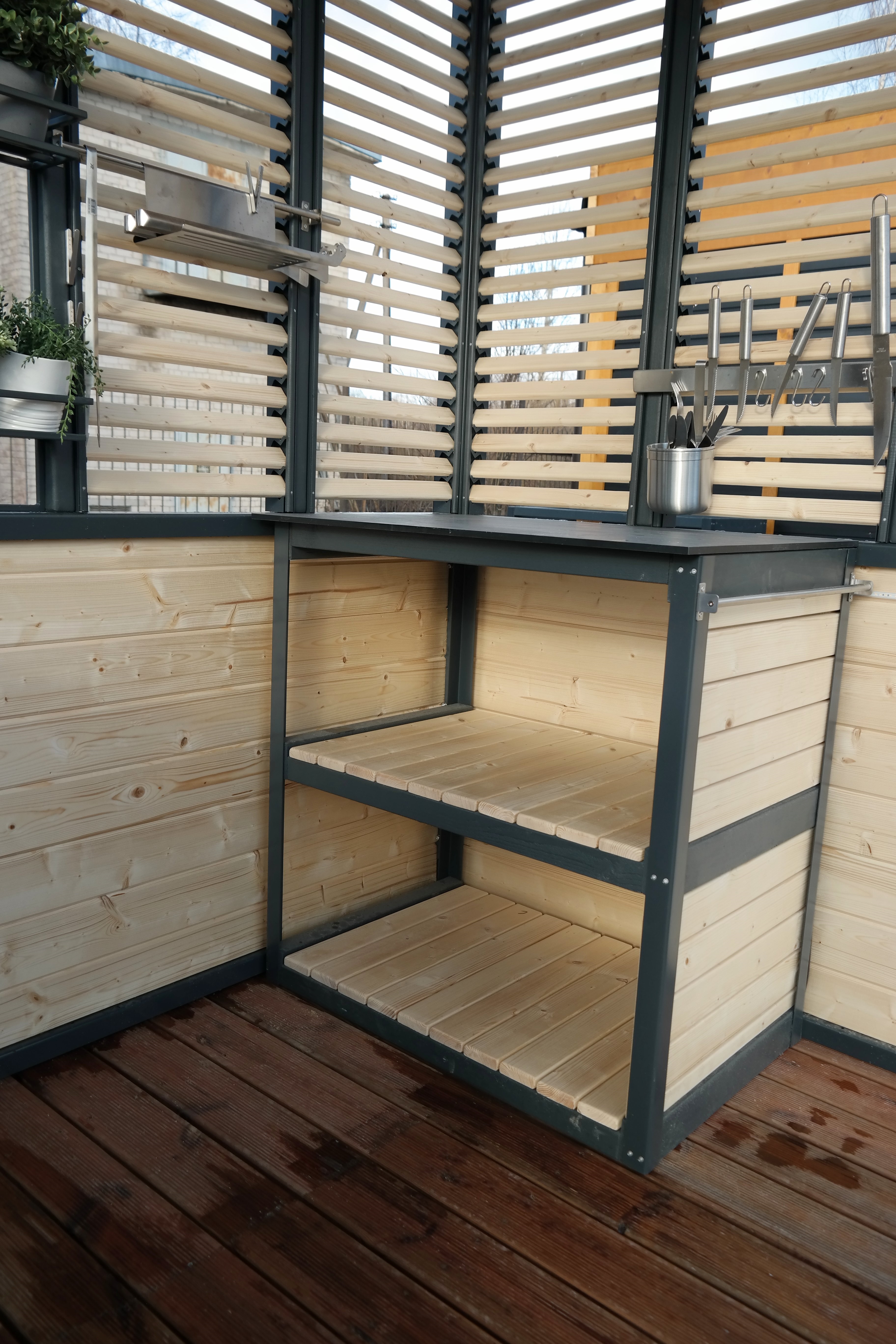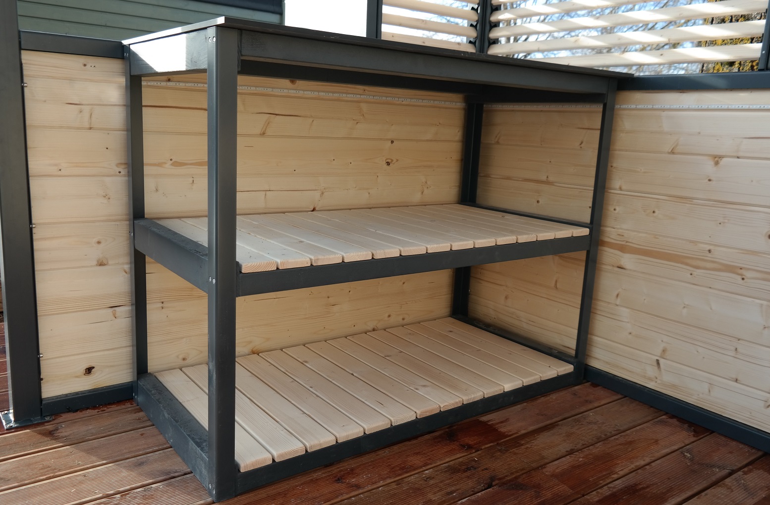 STANDARD-SET: Ein freistehender modularer Outdoor-Küchenrahmen aus anthrazitfarbenem Stahl (S275). Unten verkleidet mit Fichtenholzwand 910 mm hoch.