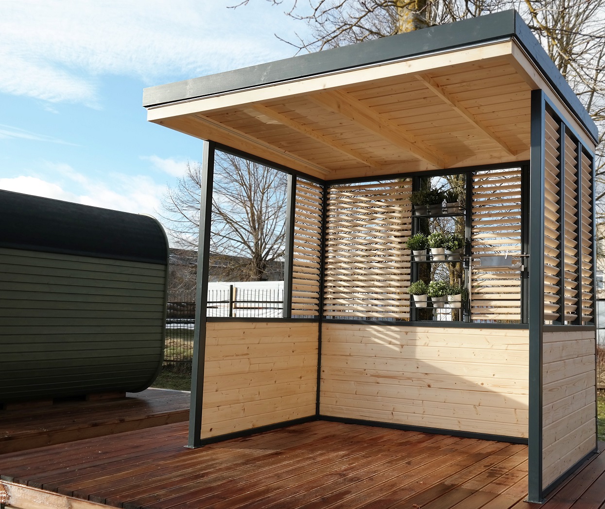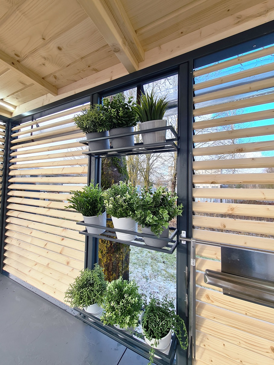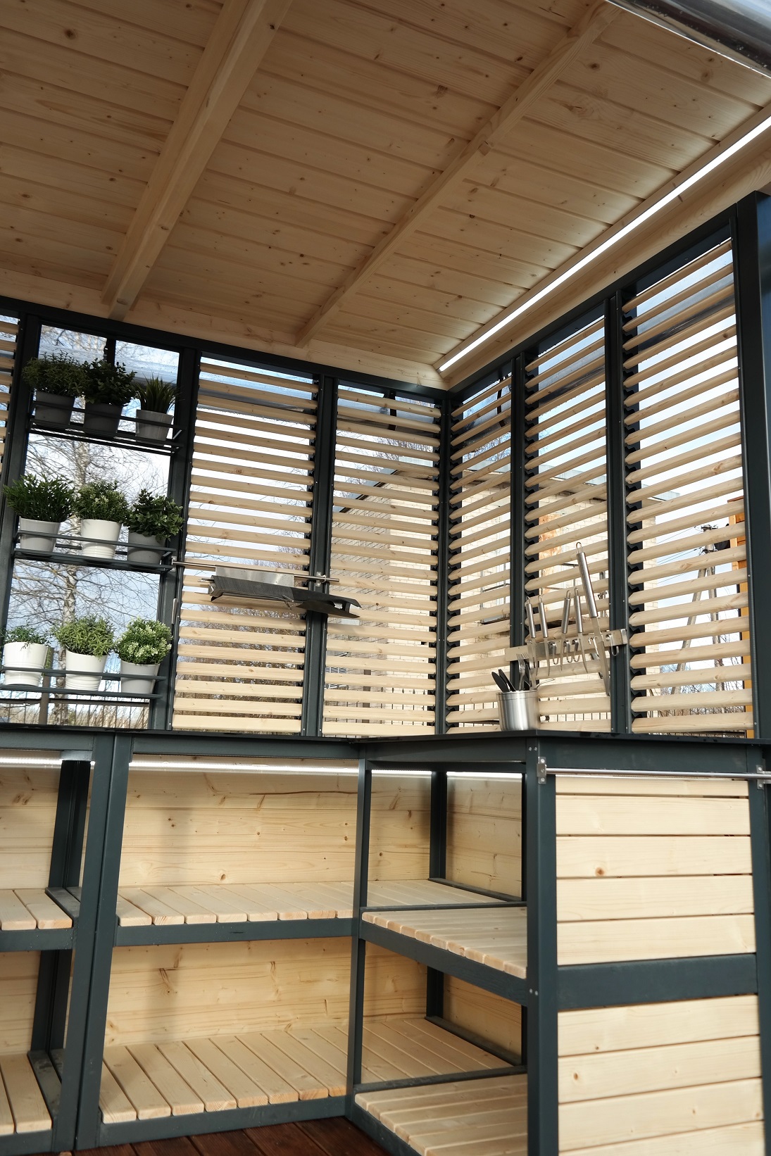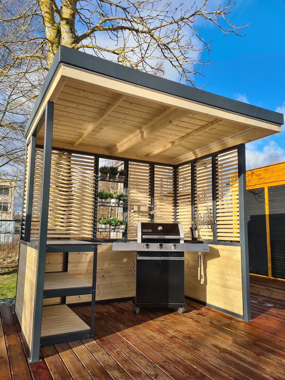 STANDARD-SET: Ein freistehender modularer Outdoor-Küchenrahmen aus anthrazitfarbenem Stahl (S275). Unten verkleidet mit Fichtenholzwand 910 mm hoch.
