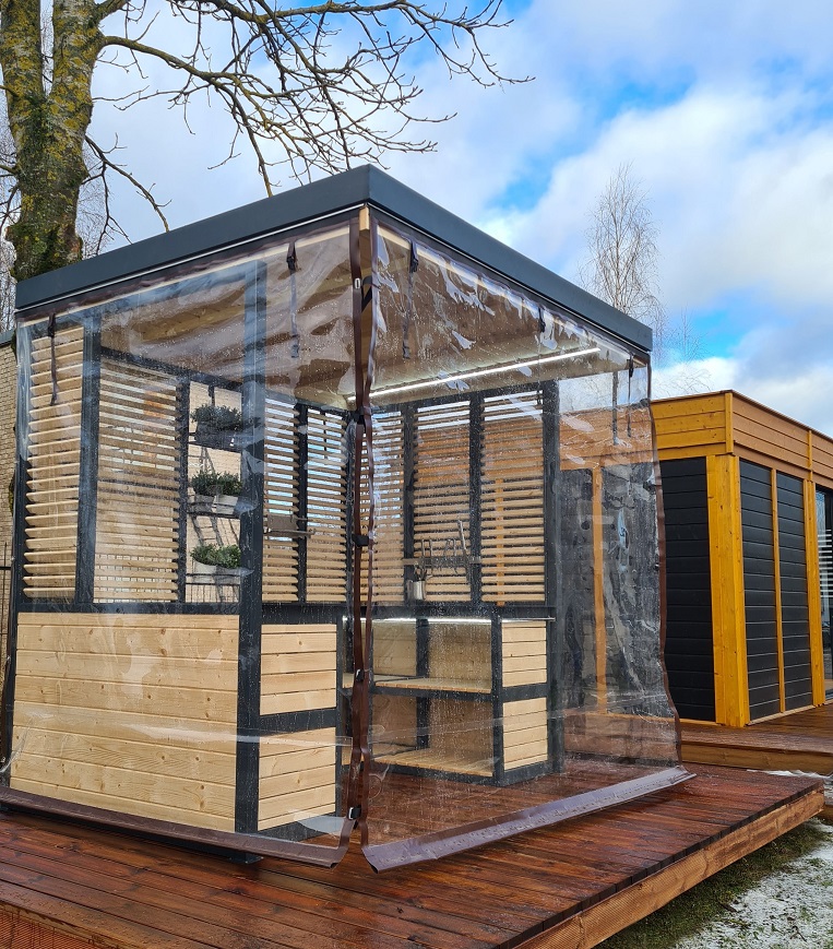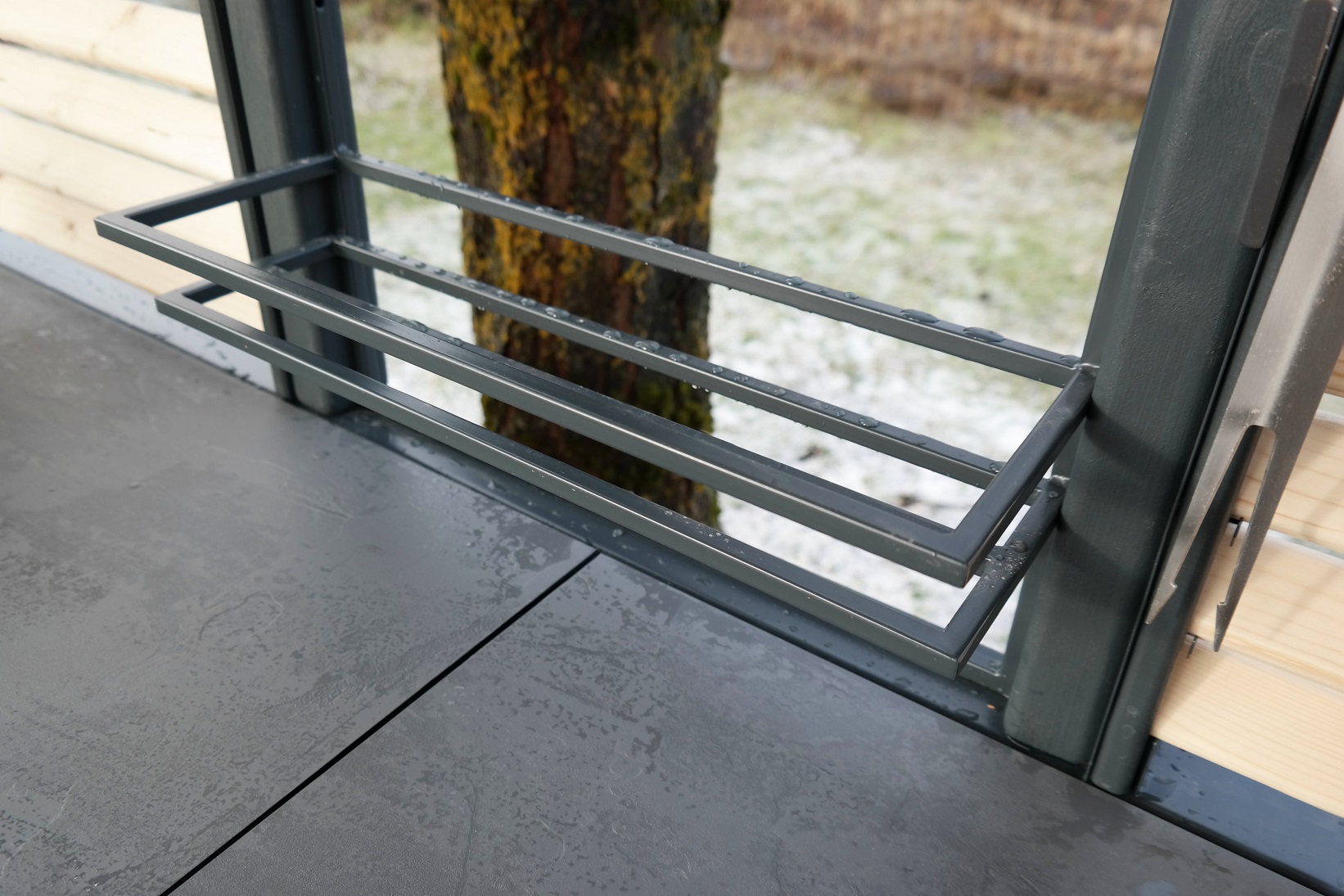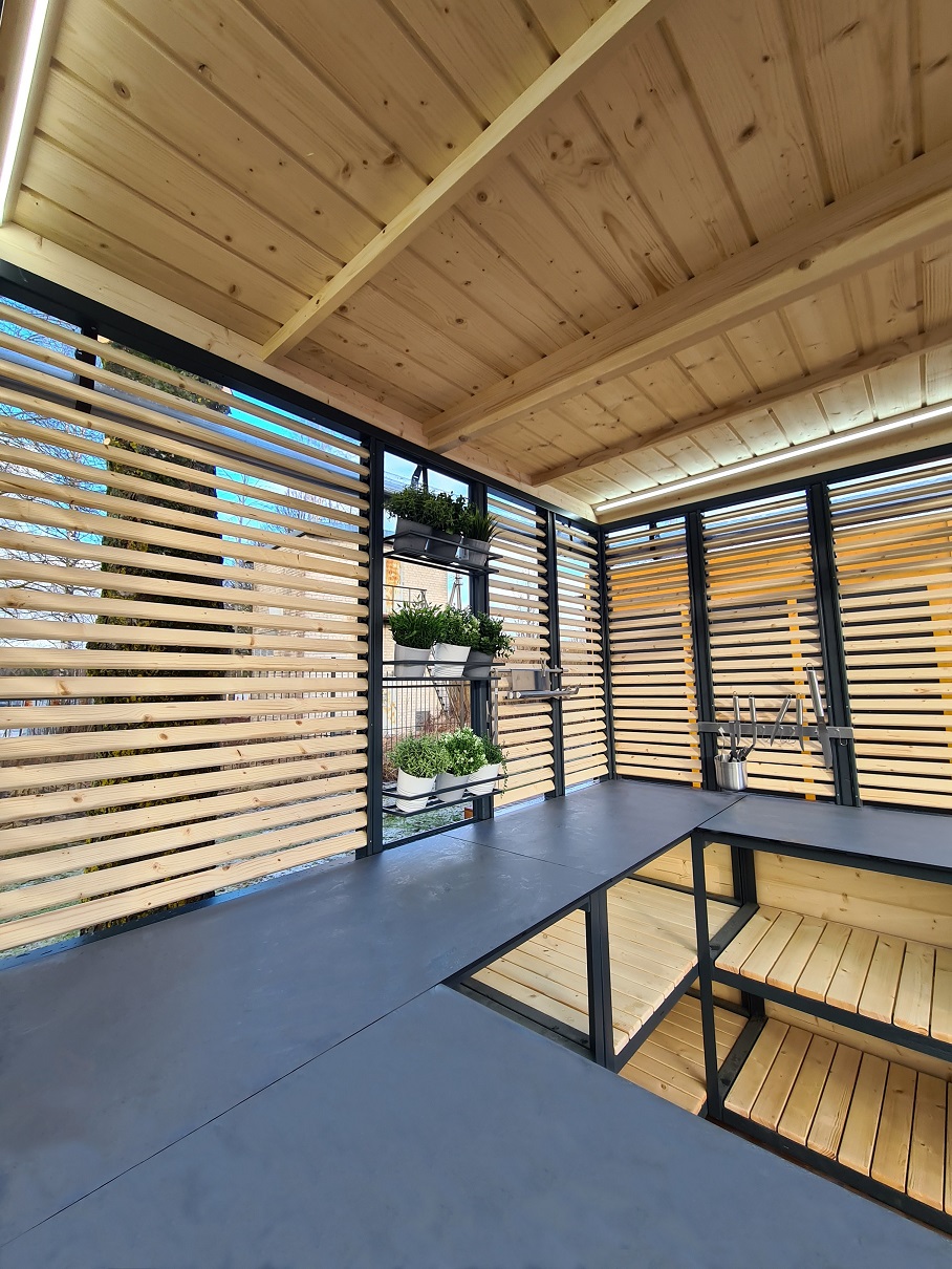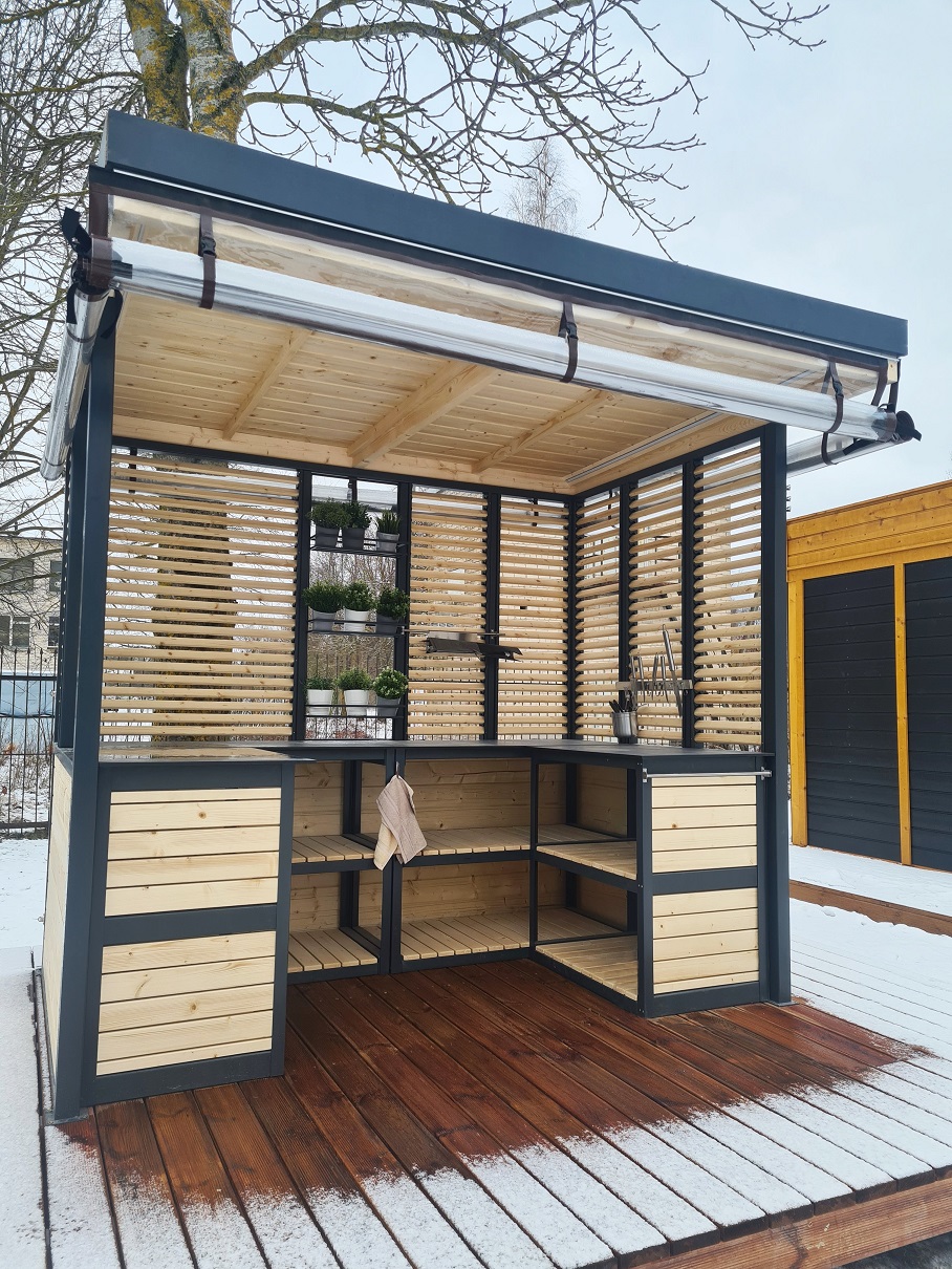STANDARD-SET: Ein freistehender modularer Outdoor-Küchenrahmen aus anthrazitfarbenem Stahl (S275). Unten verkleidet mit Fichtenholzwand 910 mm hoch.
