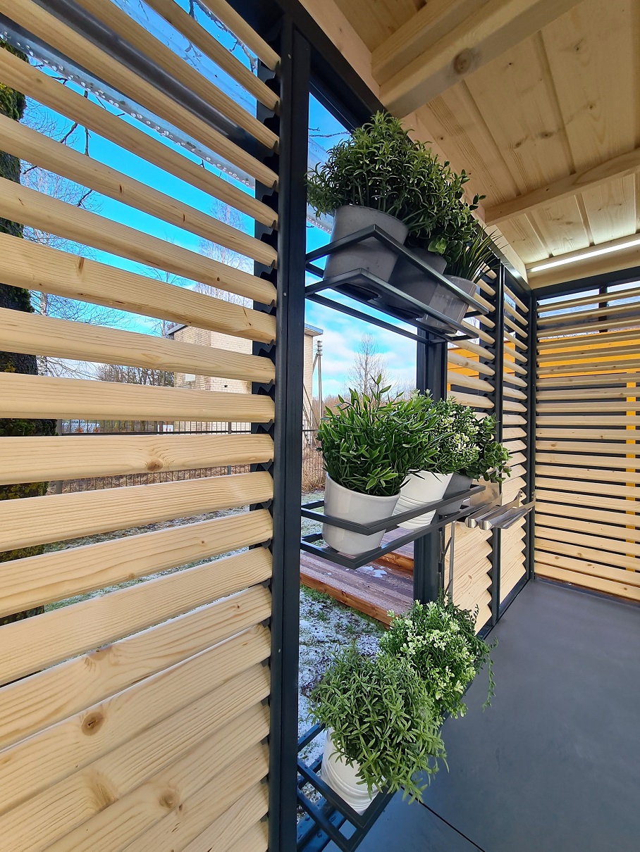 - Breites Element Sonnenschutzwand. Die Abmessungen der Wandpaneele betragen 926 x 1250 mm. Die horizontale Wand besteht aus 18 mm dicken Brettern.